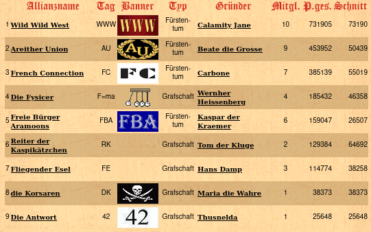 größte Allianz: Wild Wild West von Calamity Jane (10 Mitglieder)