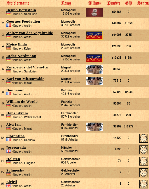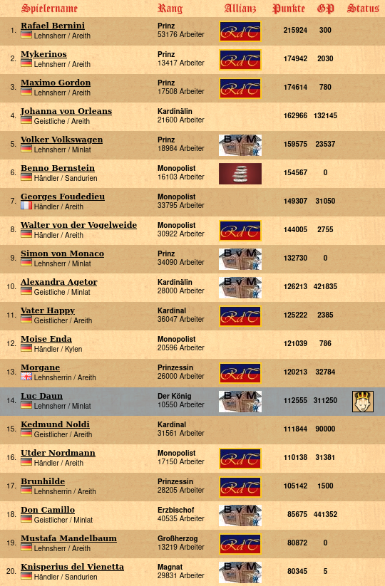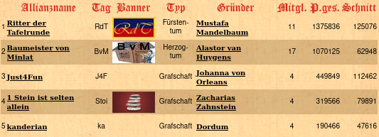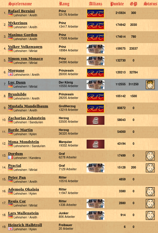 Doch nicht alle Mitglieder von J4F haben sich mit dieser Entscheidung zufrieden gegeben: Ein paar widerspenstige haben sich in einer neuen Allianz, den Rittern des Anstands (RdA) vereinigt und den Rittern der Tafelrunde einen Besuch an der Tafel abgestattet, während RdT nun auch die zweitgrößte Stadt, Monaco, belagern wollte. Ein direkter Angriff auf Monaco durch Rafael Bernini (RdT) ist erfolgreich abgewehrt worden. Eine nachträgliche Untersuchung bei den Baumeistern von Minlat (BvM), der Allianz des Stadtherren Simon von Monaco, ergab, daß der Angriff von den Provinzen des geschätzten Kollegen Alva Ians ausging, da selbiger den RdT zu Rundenbeginn Stationierungsrechte erteilt hatte und diese vergessen hatte zurückzunehmen.